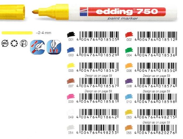 Edding Paint Markers, in matte or gloss, have outstanding adhesion even on smooth or porous surfaces. They are extremely wear-resistant on almost all surfaces. Waterproof, quick-drying edding 750, 751 and 780 markers are heat-resistant up to 400 degrees C. Valve-controlled ink flow. Ink with no added toluene/xylene.