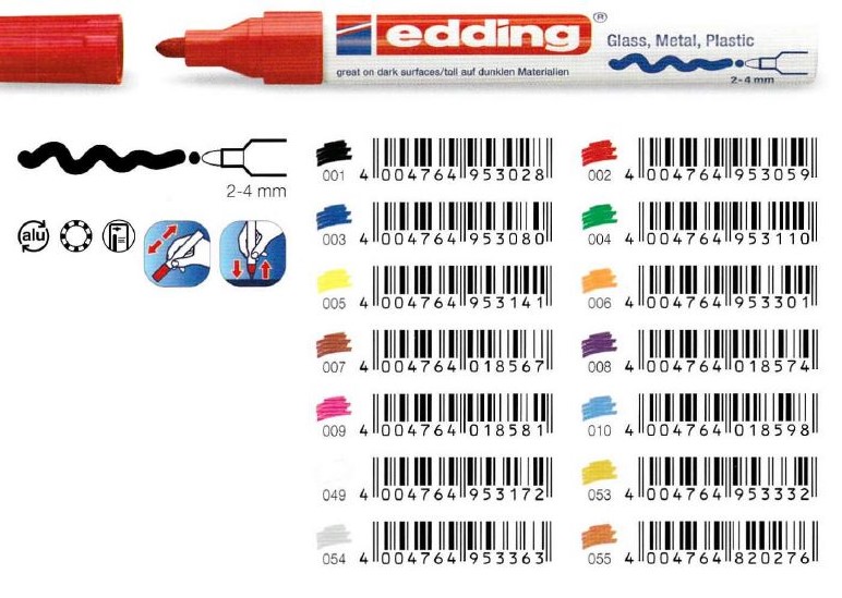 High-quality edding Permanent Markers are ideal and dependable for writing on, marking and labeling almost all materials; e.g., metal, plastic and glass. Lightfast and quick drying. Waterproof and wear-resistant on almost all surfaces. Low-odor ink with no added toluene/xylene. Almost all models are refillable. (See edding 2000C below.)